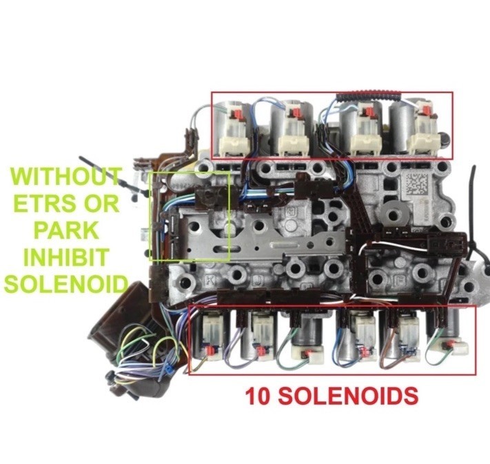 GM - 174740A, 9T45 9T50 9T60 9T65, VALVE BODY, USES 10 PLUG WIRE, NO ETRS (ELECTRONIC TRANSMISSION RANGE SELECT), 10 SOLENOIDS, WITHOUT PARK INHIBIT SOLENOID.